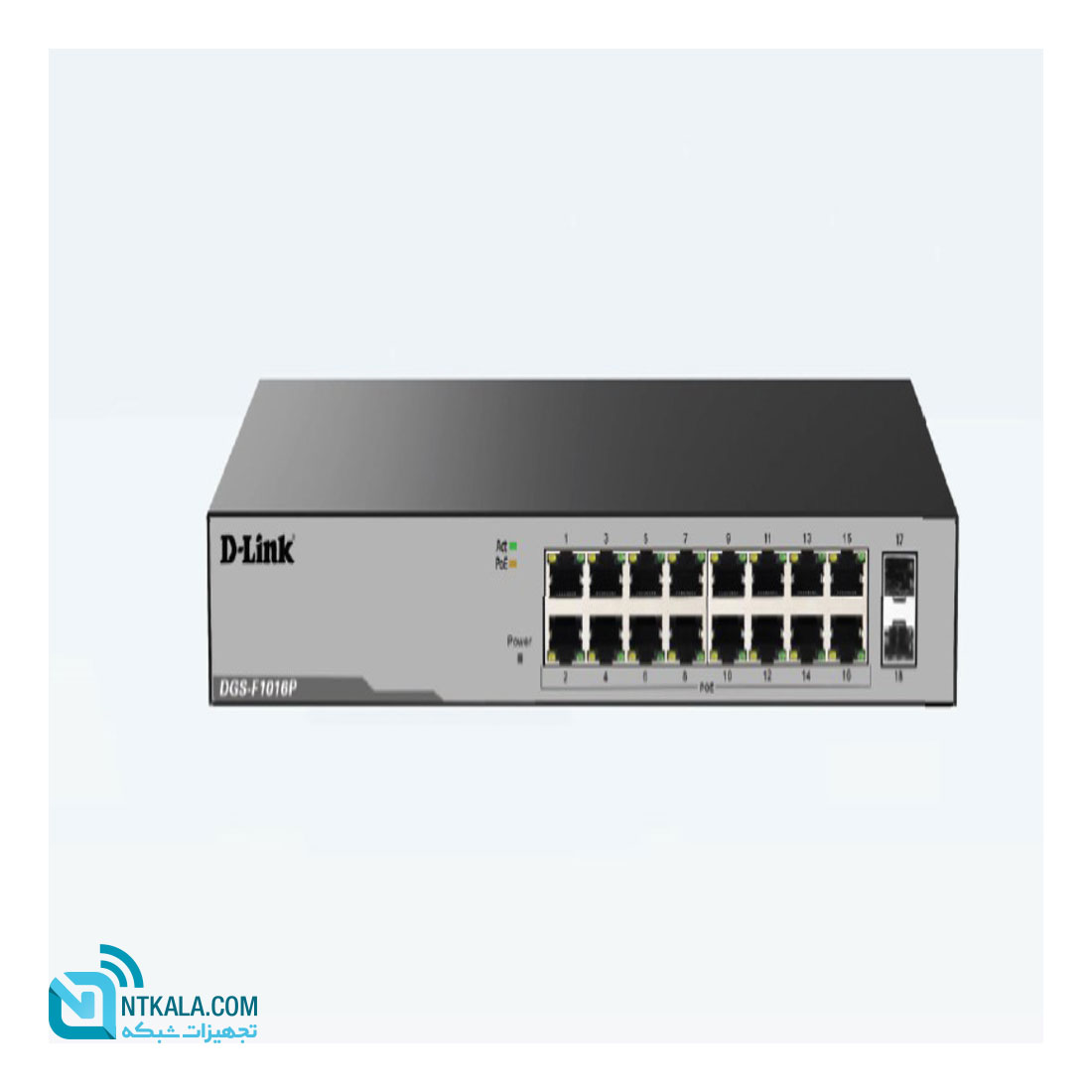 سوئیچ شبکه دی لینک مدل DGS-F1016P دارای 16 پورت 10/100/1000 مگابیت بر ثانیه PoE و 2 پورت گیگابیت SFP می باشد. که سیگنال های الکتریکی را به سیگنال های نوری تبدیل می کند . سوئیچ رکمونت 1016 دارای ویژگی هایی از قبیل توان منبع تغذیه ی 250W ، ظرفیت 36Gbps و ابعاد 44 × 180 × 320 میلی متر می باشد. این محصول در دمای بین 0- تا 40+ درجه سانتی گراد 26.8Mpps حجم اطلاعات را در هر ثانیه انتقال می دهد. که با این میزان دما زیاد داغ نمی شود و کارایی آن کاهش پیدا نمی کند.