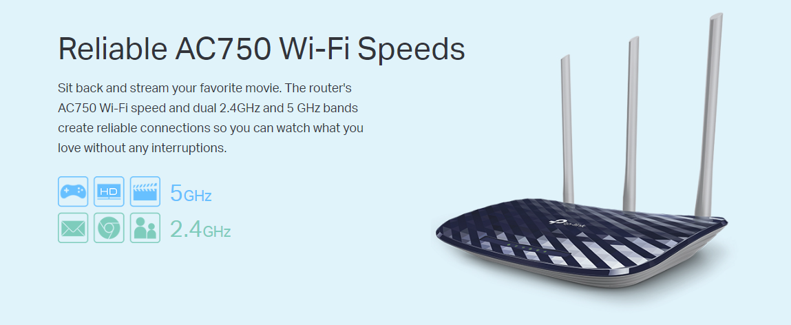 با روتر Archer C20 تی پی لینک شبکه خود را به Wi-Fi AC سریع و قابل اعتماد ارتقا دهید تا پخش جریانی روان تر در لپ تاپ ها، تلویزیون های هوشمند و دستگاه های تلفن همراه داشته باشید. باندهای دوگانه 5 گیگاهرتز (433 مگابیت در ثانیه) و 2.4 گیگاهرتز (300 مگابیت در ثانیه) به شما امکان می دهد دستگاه های بیشتری را به طور همزمان به شبکه خانگی شما متصل کنید.