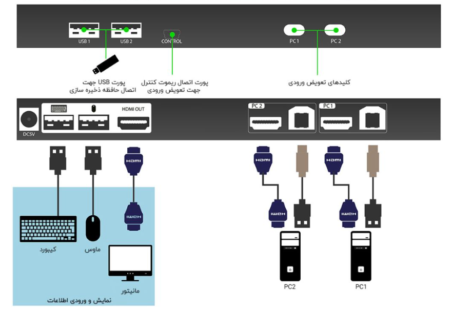 سوئیچ KVM دی لینک DKVM-210H به شما اجازه می دهد تا از طریق یک مانیتور و یک ماوس و کیبورد، دو کامپیوتر را مدیریت کنید. مانتیور از طریق درگاه HDMI و ماوس و کیبورد از طریق پورت USB وصل می شوند. این سوییچ KVM بدون نیاز به نصب درایور و بدون نیاز به آداپتور نصب و راه اندازی می شود. ( در صورت اتصال لوازم جانبی به پورت USB باید از آداپتور برقی که همراه دستگاه است استفاده کنید). این سوئیچ از قابلیت Hot Plug پشتیبانی می کند یعنی برای نصب نیازی به خاموش کردن کامپیوتر شما وجود ندارد. در پنل جلویی سوییچ یک کلید وجود دارد که می توانید از آن برای سوییچینگ بین کامپیوترها ، keyboard hot keys و smart Desktop Controller استفاده کنید. سوییچ DKVM-210H از قابلیت اسکن خودکار پشتیبانی می کند. یعنی بعد از اسکن یک کامپیوتر، KVM سوییچ به صورت خودکار روی کامپیوتر بعدی سوییچ می کند.